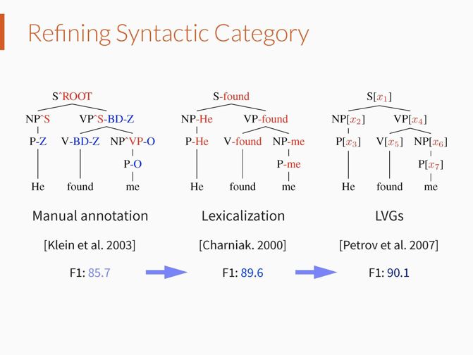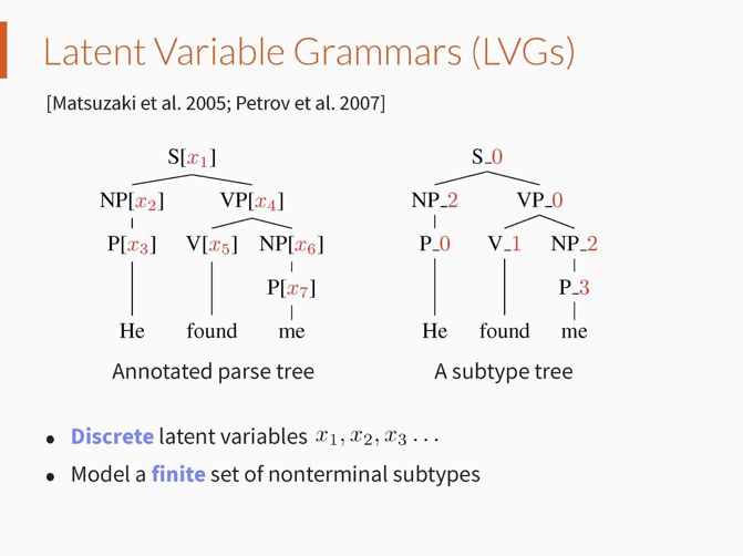 因此,之后出现了自动学习细粒度句法类别的方法,即隐变量文法(Latent Variable Grammars (Matsuzaki et al. 2005; Petrov et al. 2007))。隐变量文法为每个句法类别关联一个离散隐变量,离散隐变量的取值表示具体的句法子类别,原始句法类别的子类别个数以及文法规则的参数可以通过最大似然的方法自动学习得到。但是这种模型对于每个原始句法类别,只能建模其有限个句法子类别。