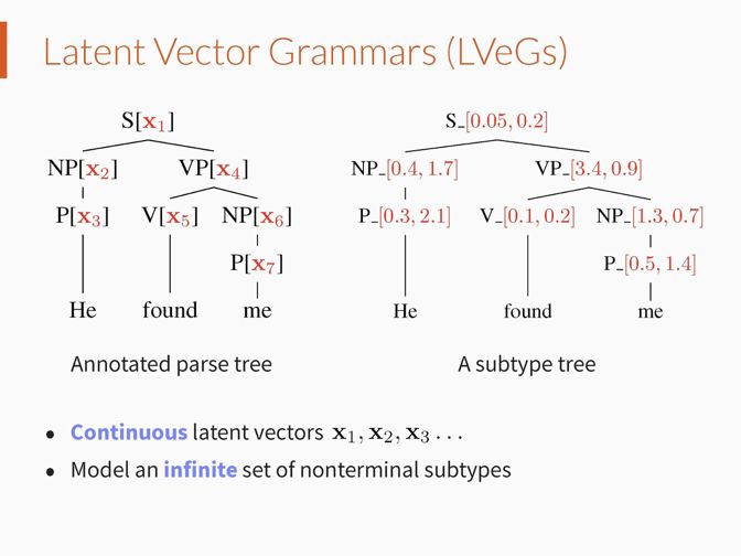 我们提出隐向量文法(Latent Vector Grammars (LVeGs)),将传统的上下文无关文法和深度学习技术连接在一起。类比隐变量文法,隐向量文法为文法规则中的每个句法类别关联一个隐向量空间,用来表示其句法子类别的连续向量空间。