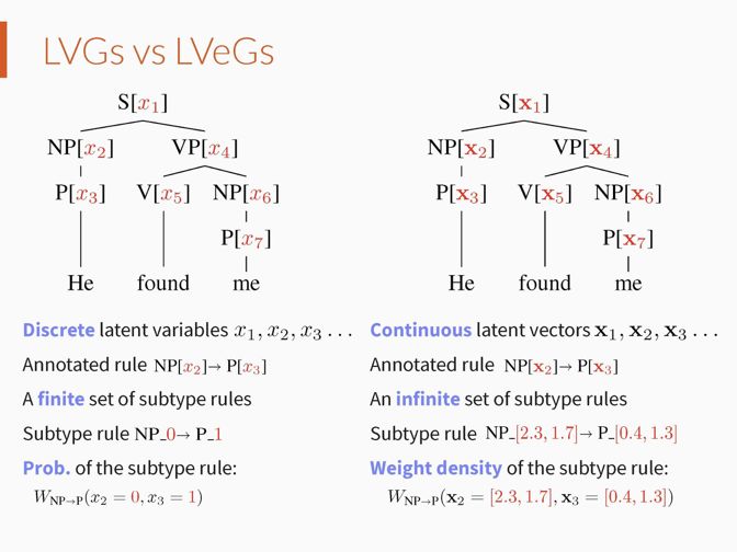 在这个连续向量空间中,每个向量代表一个句法子类别,因此 LVeGs 能够建模每个句法类别的无穷个句法子类别。需注意的是,在隐变量文法中,句法子类别构成的文法规则具有一个表示该规则概率的参数;而在隐向量文法中,句法子类别构成的文法规则具有一个表示该规则权重密度的参数。