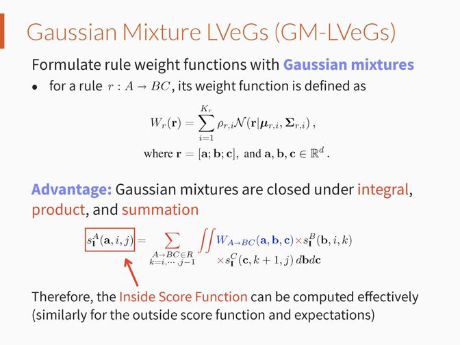 该方法的核心是对于输入语言,计算每个文法规则在每个可能的上下文位置的后验概率。为了能够高效的计算这些后验概率,我们将文法规则的权重密度函数定义为混合高斯分布,因为混合高斯分布具有在积分、乘法、加法运算上的闭合属性。我们称这种模型为混合高斯隐向量文法(Gaussian Mixture LVeGs)。