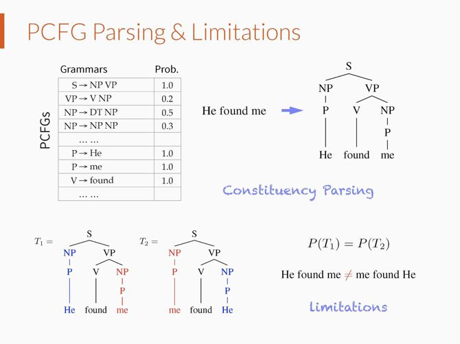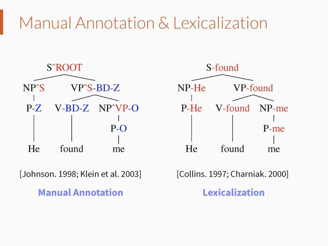在成分文法分析中,最简单的模型是概率上下文无关文法(Probabilistic Context Free Grammars),但是这种模型假设文法规则的概率和其所在的上下文位置无关。因此,其在文法分析中表现效果很差。