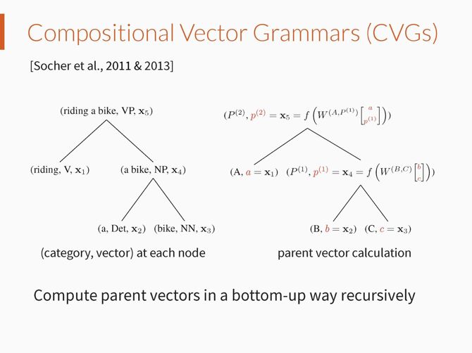在成分文法分析领域,Socher et., 2011 & 2013 将 Recursive Neural Networks 扩展并用于文法分析任务,其思路即为使用连续向量来表示句法子类别,从而在文法分析中得以使用上下文信息,以此获得更好的文法分析精度。然而这些模型在文法分析中不能使用动态规划算法进行确切推理。
