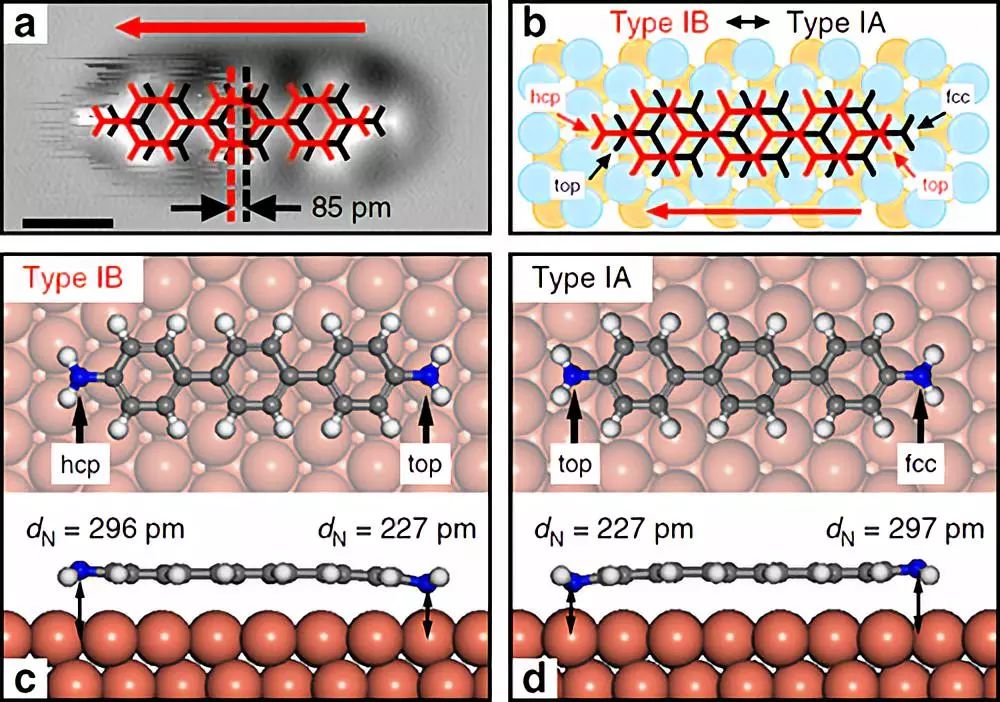 最近,杜世萱研究员(共同通讯作者)与苏州大学迟力峰教授和德国吉森大学André Schirmeisen教授合作,通过4,4″二氨基对三联苯(DATP)分子在Cu(111)表面上吸附导致的对称性破缺,实现了DATP中两个相同氨基的选择性活化。镜面对称的DATP分子在Cu(111)表面上吸附时,分子长轴沿着[11-2]及其等价晶向方向,在AFM图像中分子一端呈现模糊的特征,分子的镜面对称被打破(图1)。化学键分辨的AFM表征结合第一性原理计算揭示了DATP分子与Cu(111)的晶格失配使得分子内两个等价的氨基官能团吸附在铜表面的不同位置,一端吸附在铜原子的顶位,另一端吸附在表层Cu原子的空心位(图3)。其中吸附在顶位的氨基相比另一端的氨基与铜表面的距离更近,与表面的相互作用更强,因此活化程度更强,使其在针尖的影响下呈现非稳态特征,并且优先与2-三亚苯甲醛(TPCA)分子以氢键结合(图5)。当将DATP分子吸附在Au(111)表面上时,由于分子长度与基底晶格匹配,分子仍然保持镜面对称,两端的氨基吸附位置相同,因此两端氨基的活化程度相同(图4)。DATP分子与Cu(111)表面的晶格失配引起的分子不对称吸附和特定官能团的活性增强,为对称分子中等价基团的选择性功能化提供了一种广泛使用的途径,为表面上的不对称化学反应提供了一条新的思路。