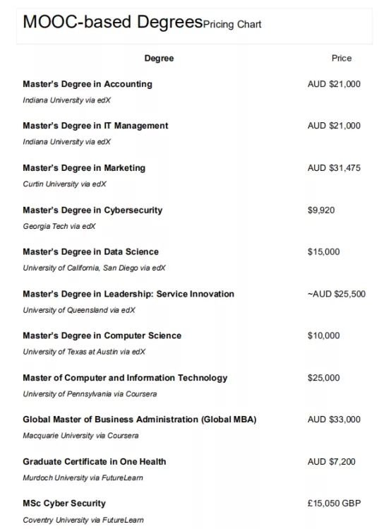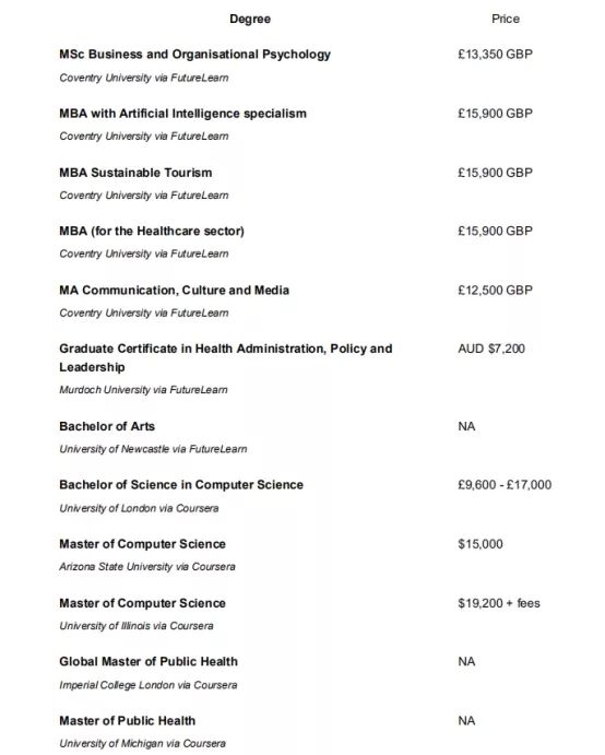 FutureLearn拥有最多的MOOC学位,但与其他供应商不同的是他们的学位往往不比其他在线课程或面对面课程便宜得多。