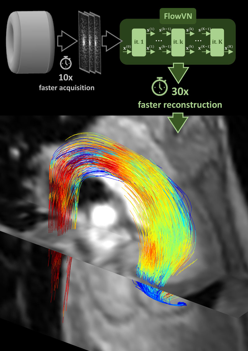 四维(4D)核磁共振扫描(MRI)可以用来重建心血管血流随时间的变化,对于一系列心血管疾病的诊断具有重要意义。然而,这些扫描通常需要 20 分钟的处理时间,意味着扫描过程中无法对进一步成像评估做出决定。加速这类扫描,就能在患者接受扫描的同时完成实时评估,不仅能节省临床医师的时间,还能减少患者的不适。