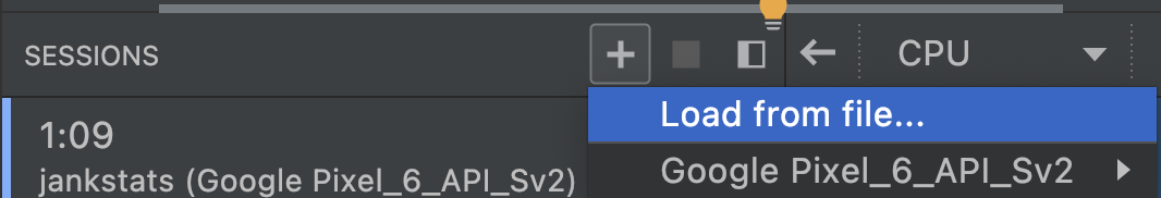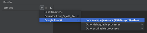 3. 点击 Profiler 左侧窗格中的 + 图标启动新的性能分析会话,然后选择要运行性能分析器的设备名称和应用进程。