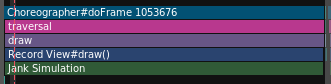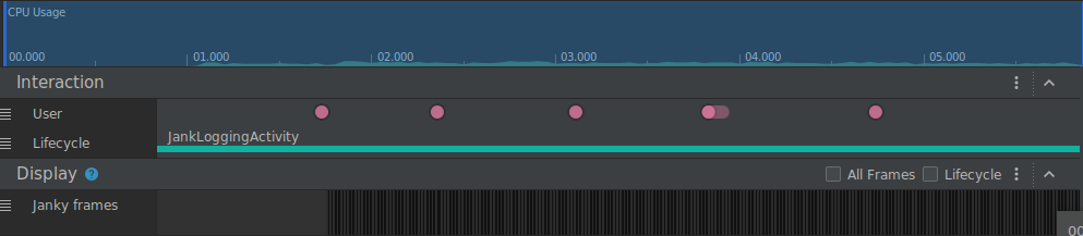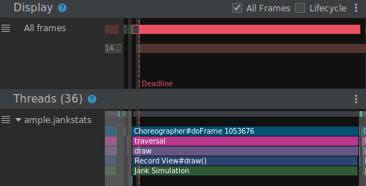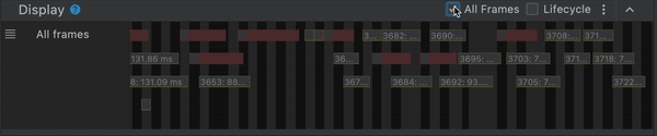 6. 与应用互动以收集数据,然后点击 Stop 按钮。Android Studio 将显示 Display 窗格,其中可见卡顿帧,也可以选中 All Frames 复选框,让轨迹记录也显示非卡顿帧。