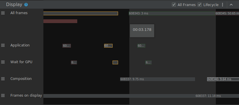 1. 在 Janky frames 轨迹中选择一个卡顿帧,Display 窗格将突出显示相应的生命周期数据,Threads 窗格将突出显示相应的线程数据。