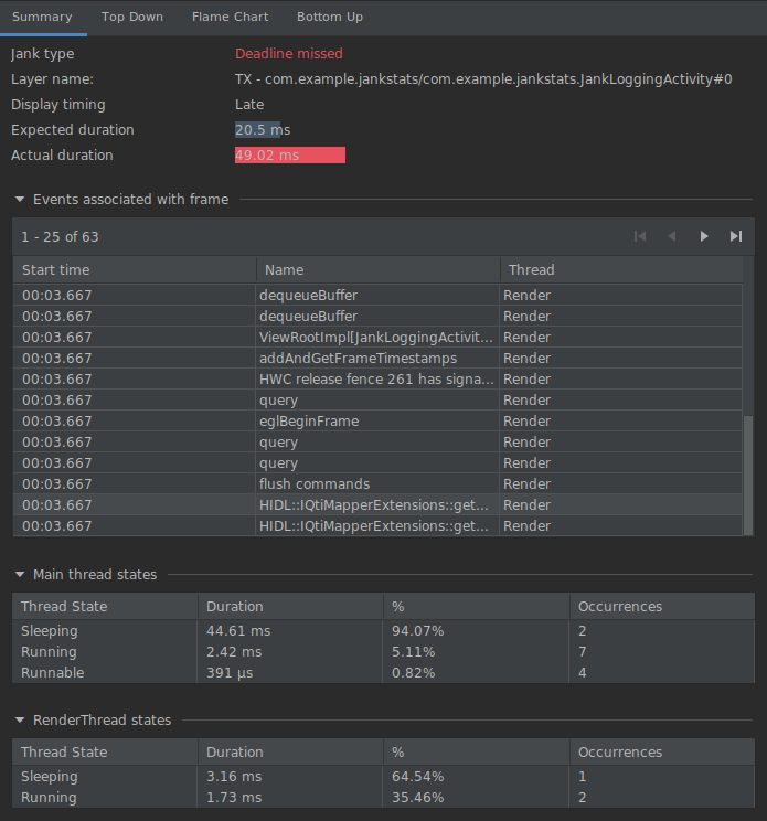 以下示例使用 GitHub 性能示例仓库中的 JankStatsSample 应用来展示如何使用 CPU 性能分析器锁定卡顿的原因: