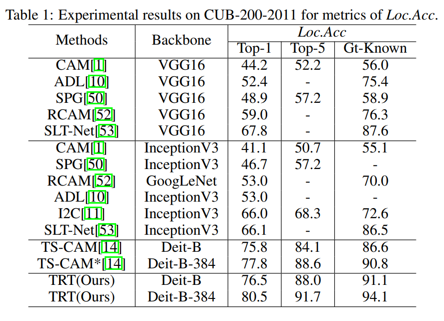 表 1:在 CUB-200-2011 数据集上的定位准确率比较