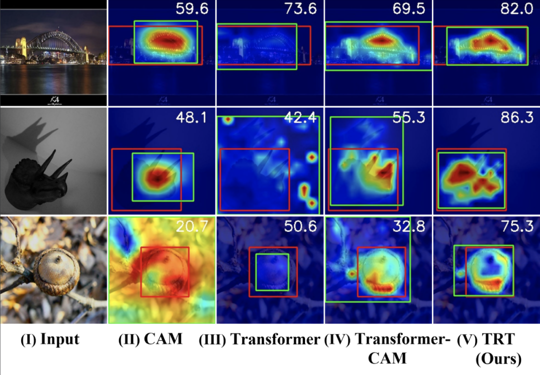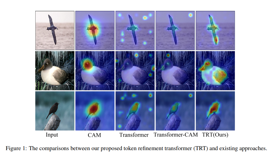 下图 1 展示了不同方法的可视化定位结果,可以看出 CAM 方法存在明显局部聚焦的问题;Transformer 的长程依赖容易产生背景误定位的现象;融合 Transformer 长程依赖和 CAM(参照 TS-CAM 论文方法)的方法虽然一定程度上缓解了局部聚焦和背景干扰的问题,但是问题依旧存在。