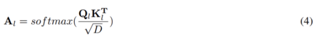 第 l 个 transformer 层的自注意矩阵公式如下式(4)所示,其中