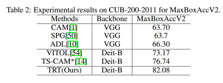 表 2:在 CUB-200-2011 数据集上的 MaxBoxAccV2 结果比较