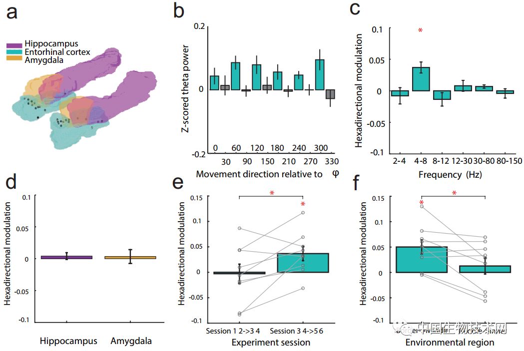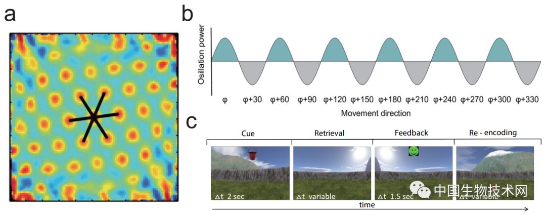 中国科学院心理研究所、北京师范大学和德国波鸿鲁尔大学的研究人员共招募了9名住院癫痫患者(分别来自清华大学附属玉泉医院、中国人民解放军总医院第一附属医院和德国Freiburg大学医学院),他们因药物治疗无效而需要接受手术治疗。术前医生会在患者脑内植入多根深部SEEG电极以精确评估癫痫灶的位置,电极植入位置完全根据治疗目的确定,与该研究无关。实验过程中受试者需要完成一个有关物体-位置关联记忆的虚拟现实任务(图1c),与此同时,研究者通过颅内电极直接记录大脑皮层的场电位信号,进而采用参数化线性回归的方法计算虚拟移动方向与内嗅皮层不同频率的信号强度之间的关系。前人研究提示,当网格细胞成功编码空间位置后,神经元发放会形成 6个间隔60度的主轴方向(图1a黑线):当被试沿着主轴方向运动时,网格细胞放电更剧烈,而沿着非主轴方向运动时,网格细胞放电相对微弱。研究假设神经振荡信号的振幅受到运动方向的调制:振幅与运动方向之间存在6周期的旋转对称性(图1b)。