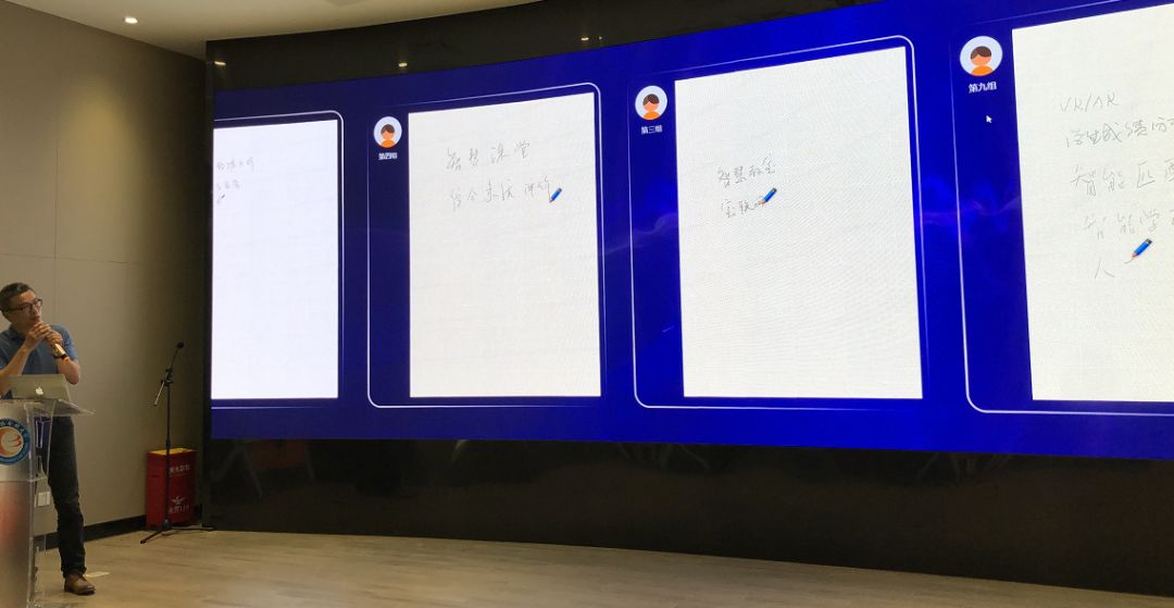 黄教授通过提问的形式展开互动——“人工智能对教育中的应用?”,现场老师借助新维空间站“慧板”,使用普通的纸、笔,在不改变和影响原有书写形式和习惯的基础上写下答案,同时三地教师所书写的内容、过程和进度实时显示在大屏上,实现了不同组之间的分享&交流&点评。