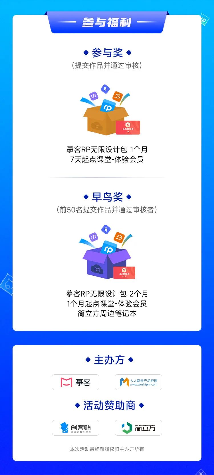 同时希望你的创意与想法能够在摹客产品中得以验证,让原型工具更上一层楼,助力其他产品经理更高效输出作品。