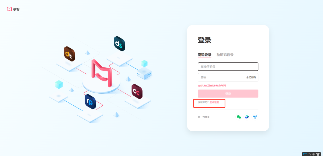 打开摹客官网,跳转注册:https://996.pm/7dqvQ,创建属于自己的账户![ 若已经是摹客用户,可直接登录 ]