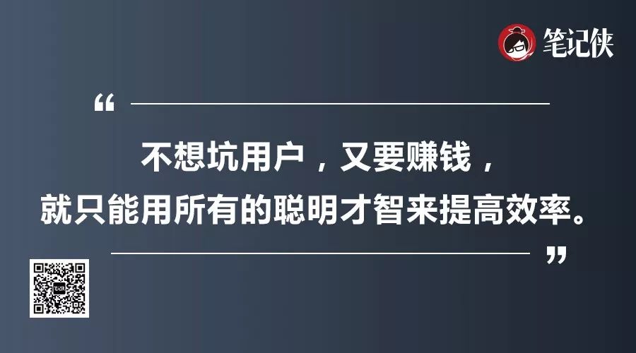 “我不记得在哪里看过一句话,说企业不赚钱就是犯罪,企业的社会使命就是要赚钱提高效率。但是类似于亚马逊的神话,只有贝佐斯做到了,一般人是做不到的。而我们既然不想坑用户,又要赚钱,就只能用所有的聪明才智来提高效率。”