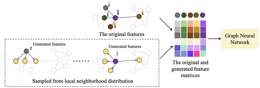 针对该问题,本文提出了一种简单而有效的数据增强方法,局域数据增强,即通过学习邻域节点关于中心节点表征的条件概率分布,生成更丰富的特征,来增强GNN的表达能力。局域数据增强是一个具有广泛适用性的框架,可以被即插即用地嵌入到任意的GNN模型中。本方法从学习到的条件概率中采样得到额外的关于每个节点的特征向量,并作为扩充后的数据用于模型的训练。