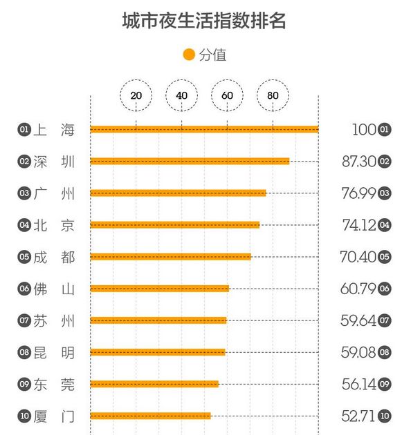 第一财经通过统计酒吧数量、夜间电影场次数量、城市夜间公交覆盖范围占比、城市地铁末班车平均结束时间及城市地铁夜间活跃站点数量、抖音夜间打卡数量、夜间活跃设备数量和夜间灯光值强度,发布“城市夜生活指数排名”榜,其中上海的深夜指数为100,排在第一位。