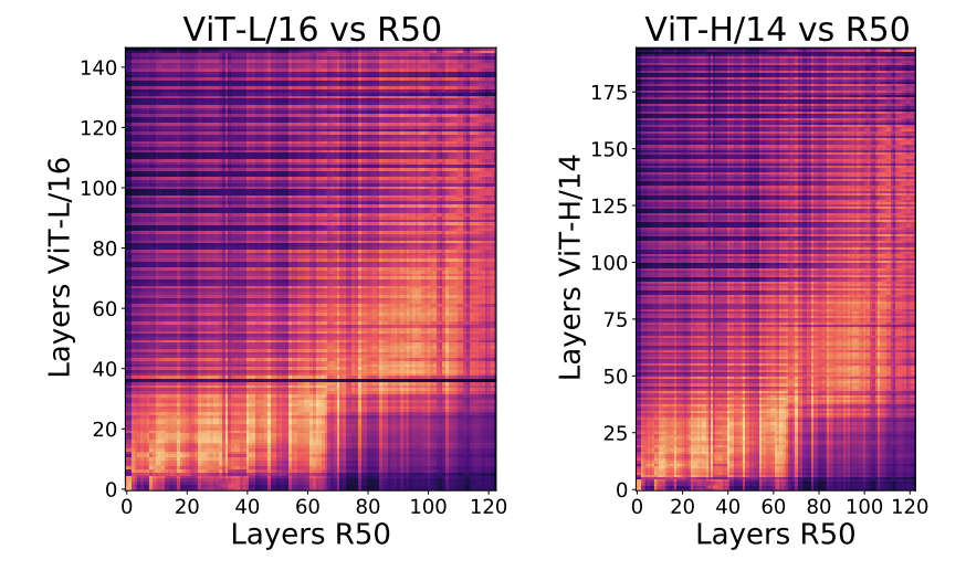 这个指标的优势在于,它能够确定基于不同随机初始化和不同宽度训练的神经网络的隐藏层之间的对应关系。因此,适合用于寻找ResNet和ViT中是否存在有对应的网络层。