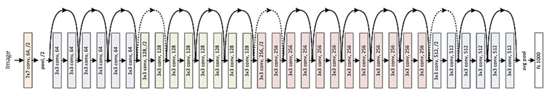 首先是 ResNet,深度残差网络,2015年ImageNet挑战赛冠军。通过如下图所示的残差块实现网络层上的跳跃,从而将模型的优化目标从寻找函数的等价映射改为了逼近零,弱化了网络变深对模型性能的负面影响。目前为止,基于ImageNet数据集训练的ResNet50仍然是图像处理任务中使用频率最高的预训练模型之一。