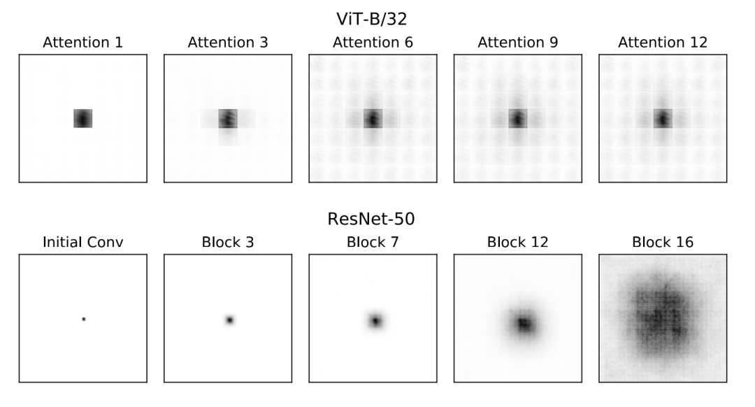 两个在底层表征上有相似之处的网络,居然长着长着发展到了两个方向。因为ResNet在处理输入时,需要经过更多层才能获得类似于ViT底层的表征,由此引发了一个合理的猜想:两个网络在整合全局信息的能力上存在差异。