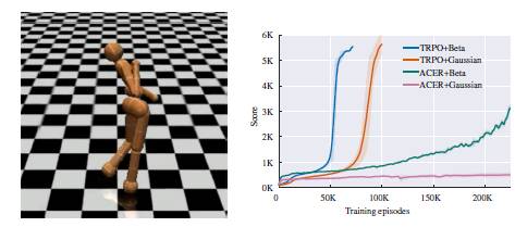 本文由卡内基梅隆大学发表。假设输出的连续控制信号从Beta分布中采样,本文通过一个深度神经网络直接学习、预测Beta分布的两个参数。在连续控制的文献中,以往工作多采用高斯分布假设并直接学习和预测高斯分布的均值和方差。但高斯分布在数值上是无界的,对一些需要安全策略的场合这种性质极不合理。例如,自动驾驶中,左右打盘的角度无论如何不能太大。而Beta分布刚好满足左右有界这一性质(如下图)。