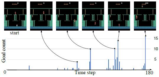 实验表明该方法确实能够成功的自动发现「子目标」并学出「子策略」。下图展示了该方法在「蒙特祖玛的复仇」游戏环境[1]上的结果。