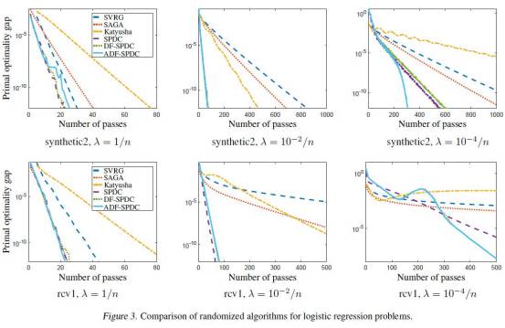 这篇论文由芝加哥大学和微软研究院共同完成,提出两类新的原对偶一阶算法来求解经验风险最小化的凸优化问题。通过自适应地利用样本数据中暗含的强凸性质,文中证明了这两类新算法的线性收敛速率。另外,通过利用Dual-free的技巧,文中将算法中Euclidean距离下的邻近算子替换为Bregman距离下的邻近算子,从而得到两类Dual-free原对偶算法变体。最后实验证明该算法的有效性。