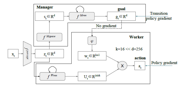 本文由Google DeepMind发表。策略网络被划分为两个模块:管理者和工作者。管理者模块在低时间分辨率工作,产生中长期子目标;工作者模块在高时间分辨率工作,从管理者模块拿到子目标,并上原始的环境观测一起输出当前时刻的决策动作。本文这种精巧设计的网络结构能自动「发现」子目标,并自动学出相应的「子策略」,而之前的工作都采用了手调子目标的方式,在灵活性和通用性不如本文所提出的算法。