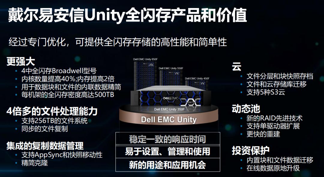 面向广泛企业及组织用户,戴尔易安信Unity及SC中端存储产品系列向客户提供灵活便捷及经济有效的转型路径,为客户带来更多选择。采用英特尔®至强®处理器的戴尔易安信Unity全闪存和混合闪存存储平台通过优化闪存的性能和效率,提供完全集成的存储区域网络 (SAN) 和网络连接存储 (NAS) 功能,通过提供卓越的高性能和简化性,帮助企业加速业务、简化管理并将存储无缝分层至云。同时,Unity具备更为灵活的操作环境,可部署于众多配置中,包括融合及超融合系统、专用存储阵列或软件定义的虚拟存储等应用装置。