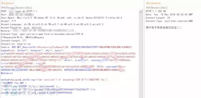 我们对登陆功能进行测试,尝试了下DTD,发现没有被禁掉!行动!
