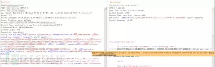 发送构造好的payload,虽然发现xml解析错误的提示: