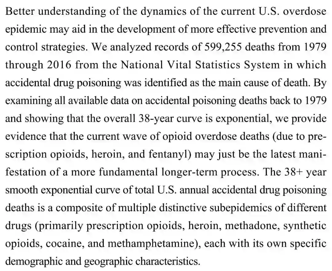 (导读 郭思瑶) 科学家通过分析1979年至2016年间美国国家人口动态统计系统中599,255份主要死因是药物中毒意外的案例,发现这38年的整体趋势符合指数增长特征。现今因阿片类药物过量致死的问题只是长期积累的表面效应,是多种处方阿片类药物的不同流行趋势综合作用的结果,每种药物有其独特的地理和人群分布特征。该研究有助于开发更有效的药物滥用防控策略。