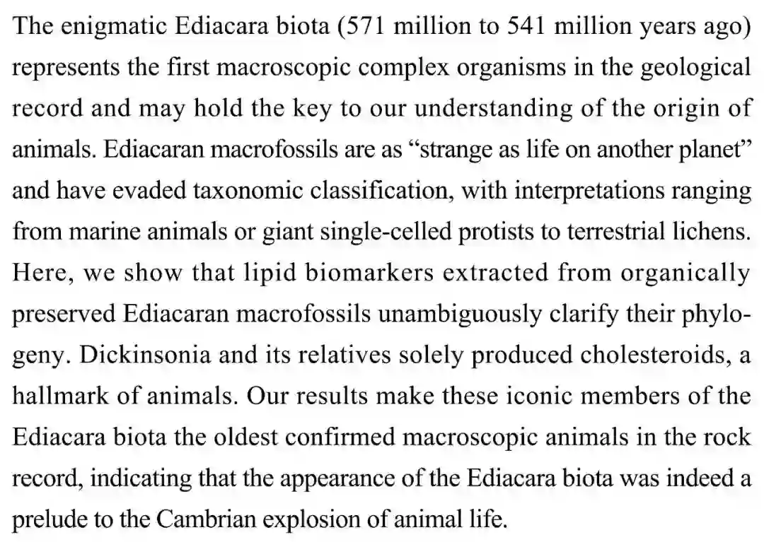 (导读 阿金)埃迪卡拉生物群(距今5.71到5.41亿万年)是地质记录中第一批宏观复杂生物体,也是了解动物起源的关键。本研究展示从埃迪卡拉大化石中提取出的脂质生物标志物,发现其中狄金斯水母及其近亲能够产生动物独有的标志物胆固醇,确认这些埃迪卡拉生物群成员为地史最早宏观动物,表明伊迪卡拉动物群为寒武纪生命大爆发的序章。