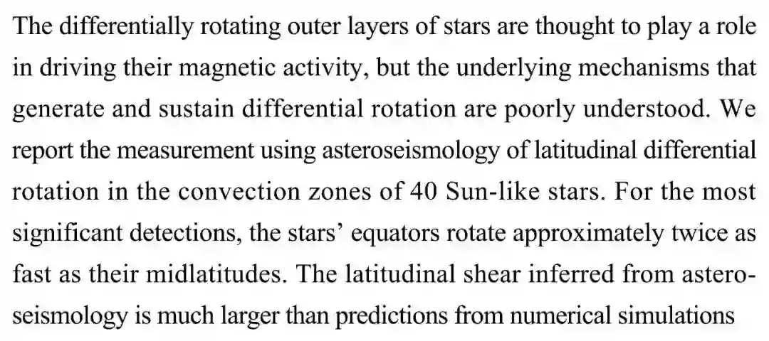 (导读 阿金)恒星外层的较差自转影响恒星的磁场活动,但是较差自传的产生和维持机制目前尚不清楚。本研究使用星震学测量40个类太阳恒星对流区的纬度较差自转,发现赤道旋转速度是中纬度区域的两倍,该数据远高于模拟预测数值。