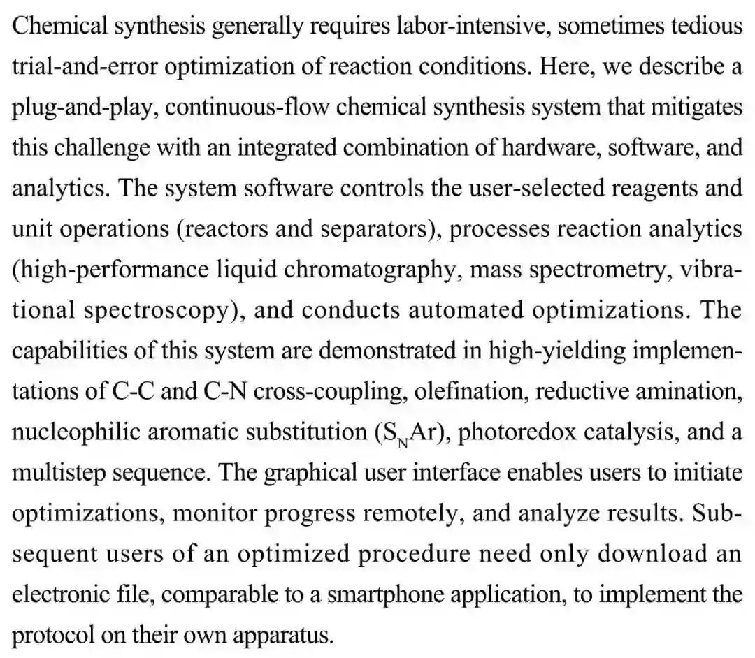(导读 卓思琪)化学合成通常需要反复试错进行优化。本文描述一种即插即用、连续流动的化学合成系统。该系统软件控制用户选择的试剂和单元操作,分析反应进程,执行自动优化。用户可以通过图形用户界面进行优化操作、远程监视以及结果分析。而优化程序的后续用户仅需下载一个电子文件,就可以在自己的设备上实现协议。