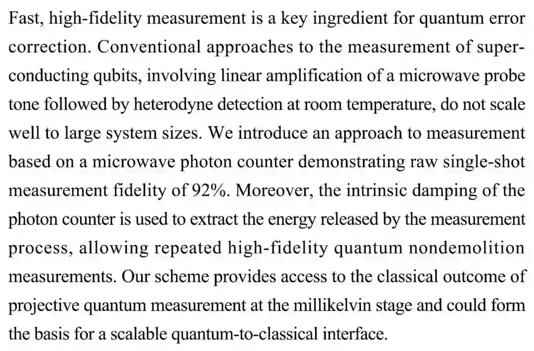 (导读 阿金)快速且高保真测量是量子纠错的关键,传统测量超导量子比特的方法无法应用于大尺度系统中。本研究引入一种基于微波光子计数器的测量方法,原始单次测量保真度为92%,其固有阻尼可用来提取测量过程中释放的能量,实现重复的高保真量子非破坏测量。研究结果能实现毫开尔文量级的测量,以及为量子到经典结果提供基础。