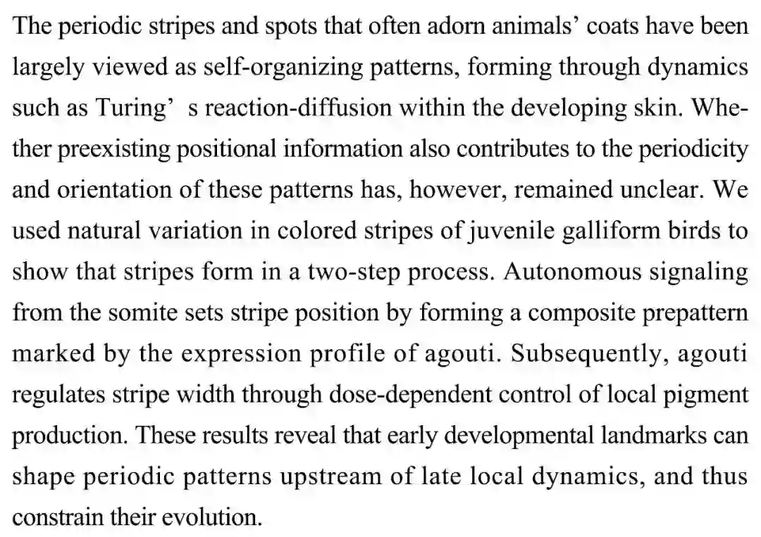(导读 郭怿暄)研究者认为动物体毛的周期性条纹和斑点是通过图灵反应扩散模型在皮肤上自组织产生的,但图案的方向性和周期性是否由预先存在的位置信息决定尚不清楚。本研究利用幼年期鸡形目鸟类着色条纹的天然变异发现,来源于体节的自主信号通过agouti表达形成复合预模式来确定条纹位置,而agouti可剂量依赖地调控局部色素合成以控制条纹宽度。