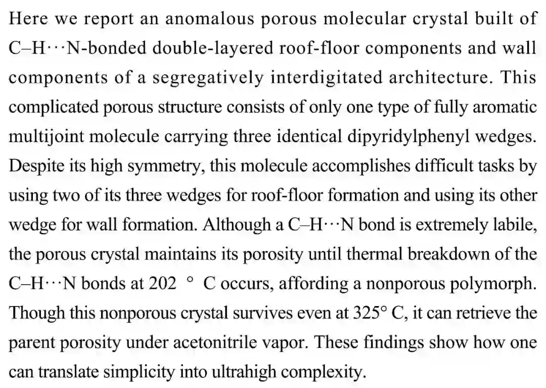 (导读 阿金)本研究报告由碳—氢n键结合的双层顶部-底部组件和隔离交叉的墙壁组件构建的多孔性分子晶体,该复杂结构仅有一种全芳香多联分子,具有高度对称性,且保持其孔隙率直到在202°C碳氢键发生热分解为止。该发现证明将简单性转变为超高复杂性的可能性。