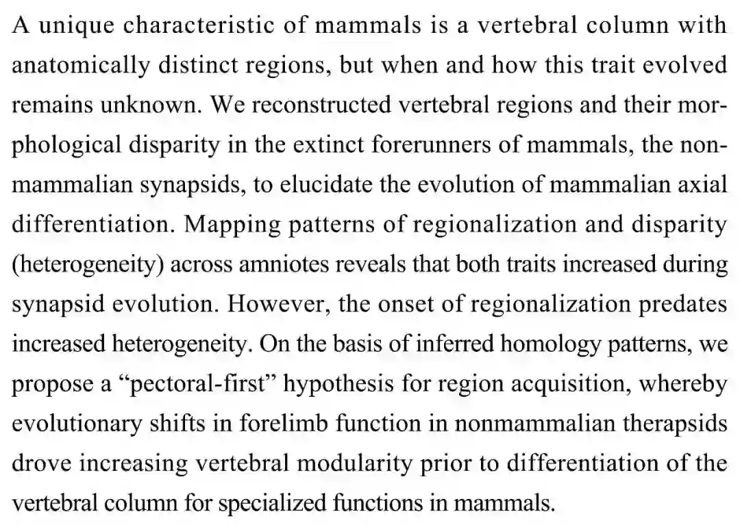 (导读 过泽远)区域化的脊椎是哺乳动物的独特特征,但是其演化时间和方式仍属未知。本研究通过重建已灭绝的哺乳动物祖先 --- 下孔类动物---的脊椎区域和形态差异来阐明哺乳动物的轴向分化。通过同源性模式的推论,研究人员提出一个“胸腔先进化”的假设:非哺乳类兽孔目前肢的进化导致脊椎的模块化优先于脊椎的分化而发生,赋予哺乳动物特殊功能。