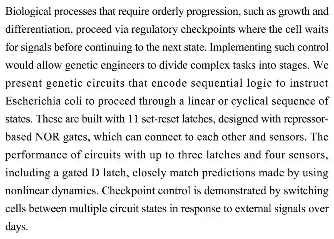 (导读 郭思瑶)生物进程需要调控检查点的信号释放才能有序进行。科学家基于抑制子的NOR门控来设计遗传回路,从而调控大肠杆菌。这个最多涉及到三个门闩和四个传感器零件的回路系统在细胞内的表现与预期十分相近。检查点调控通过多重回路的转换应对细胞外部信号刺激。