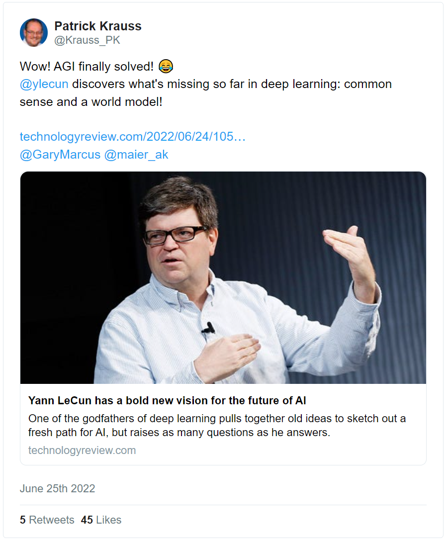 早先,LeCun那个「宣言」文刚发出来时,就有德国计算神经学家、AI研究人员Patrick Krauss 发推「恭喜」,看起来我们离AGI只差两个东西,一是常识、二是LeCun的世界模型。