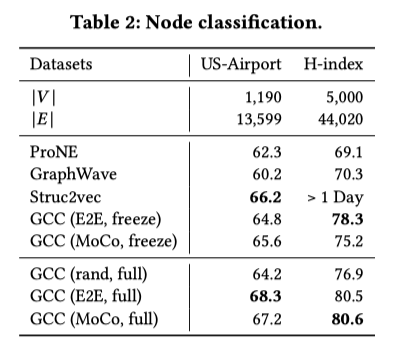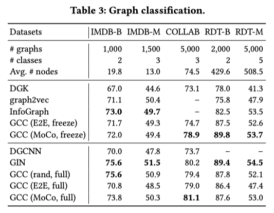 本文提出的GCC预训练框架,利用对比学习的方法,有效的捕捉了图的结构化信息,且可以迁移到各类下游任务及各类图中。实验结果表明了GCC在多中任务多个数据集上都获得了较为突出的表现,证明了GCC的有效性。