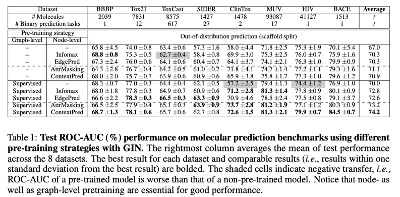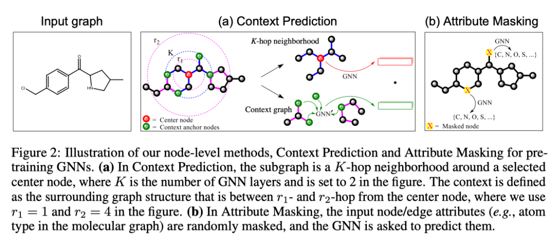 图为作者提出的节点级别的两种自监督学习方法。其中,在context prediction任务中,通过子图预测其周围的图结构,使模型具有通过中心节点预测周围结构的能力;在attribute masking任务中,让网络能够预测masked掉的节点或边,以学习图的性质及领域知识。