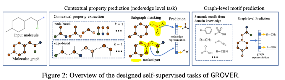 这篇文章认为不应将上下文和节点/边的信息分开考虑,由此提出Graph Representation frOm self-superVised mEssage passing tRansformer (GROVER)框架。