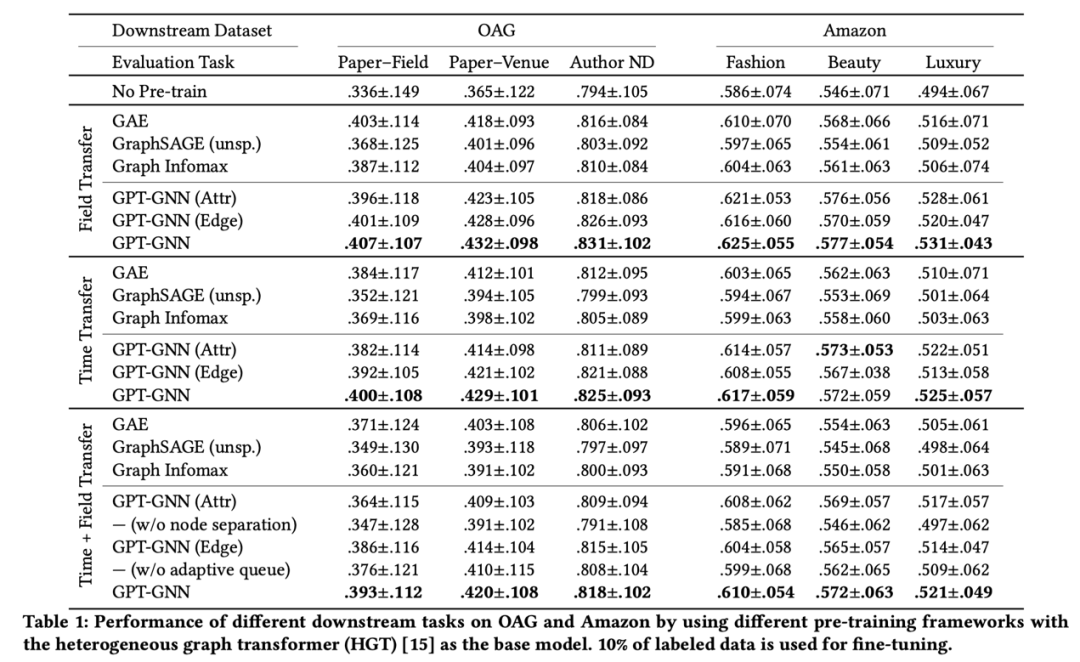 表中总结了在OAG和Amazon上使用不同的预训练方法在下游任务中表现出的性能。实验在预训练和微调阶段之间设置了三种不同的传输设置:分别使用来自2014年之前和2014年之后的数据进行预训练和微调(Time Transfer);将CS领域的论文用于下游微调,将其他领域的所有论文用于预训练(Field Transfer);在其他领域2014年之前的论文上进行预训练,并在CS领域2014年之后的论文上微调(Time+Field Transfer).总体而言,GPT-GNN框架显著提高了两个数据集上所有下游任务的性能。