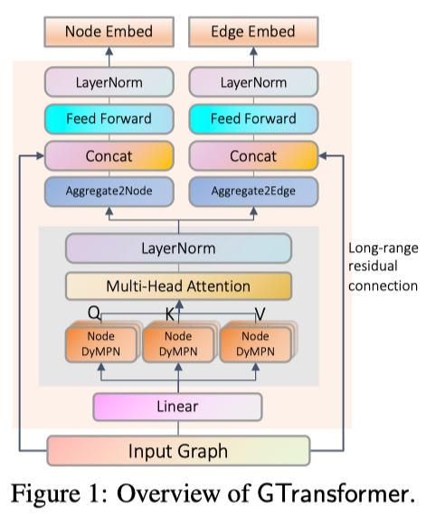 作者提出利用如上图所示的GNN Transformer模型捕捉两方面的信息:利用可随机选择跳数的动态信息传递网络dyMPN得到query, key, value的向量表示,可得到子图的结构信息;利用transformer作为encoder,可得到节点之间的全局信息。
