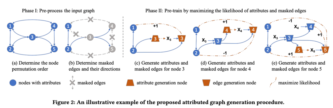 在预训练过程中,出于对训练效率的考虑,作者希望只对输入图运行一次GNN就计算出节点属性生成和边生成过程的损失,且同时进行节点属性生成和边生成两个任务。但是,边的生成过程需要用到节点的属性信息,如果两个生成过程同时进行,会导致信息泄漏。为避免该问题,文章将节点在不同的阶段分为属性生成节点和边生成节点两种类型。值得注意的是,同一节点在不同阶段既可以作为属性生成节点又可以作为边生成节点。